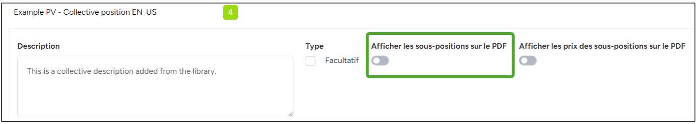 - Activez le commutateur Afficher les sous-positions sur le PDF pour inclure les sous-positions dans le transfert vers Bexio.