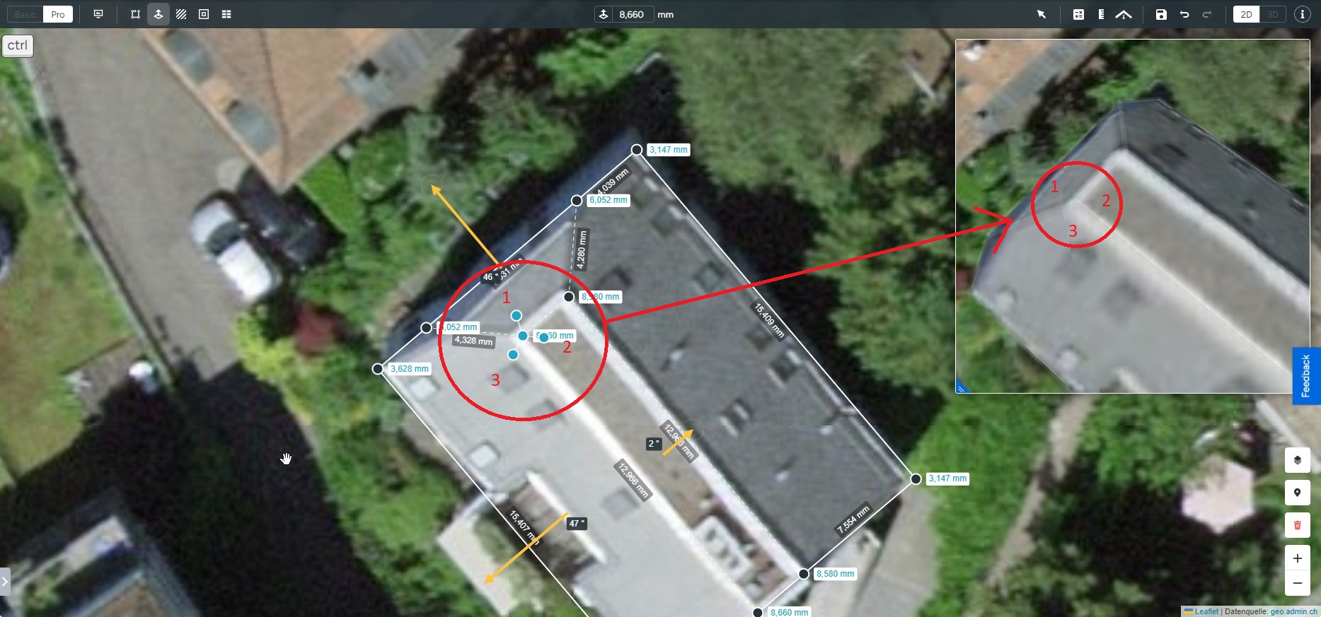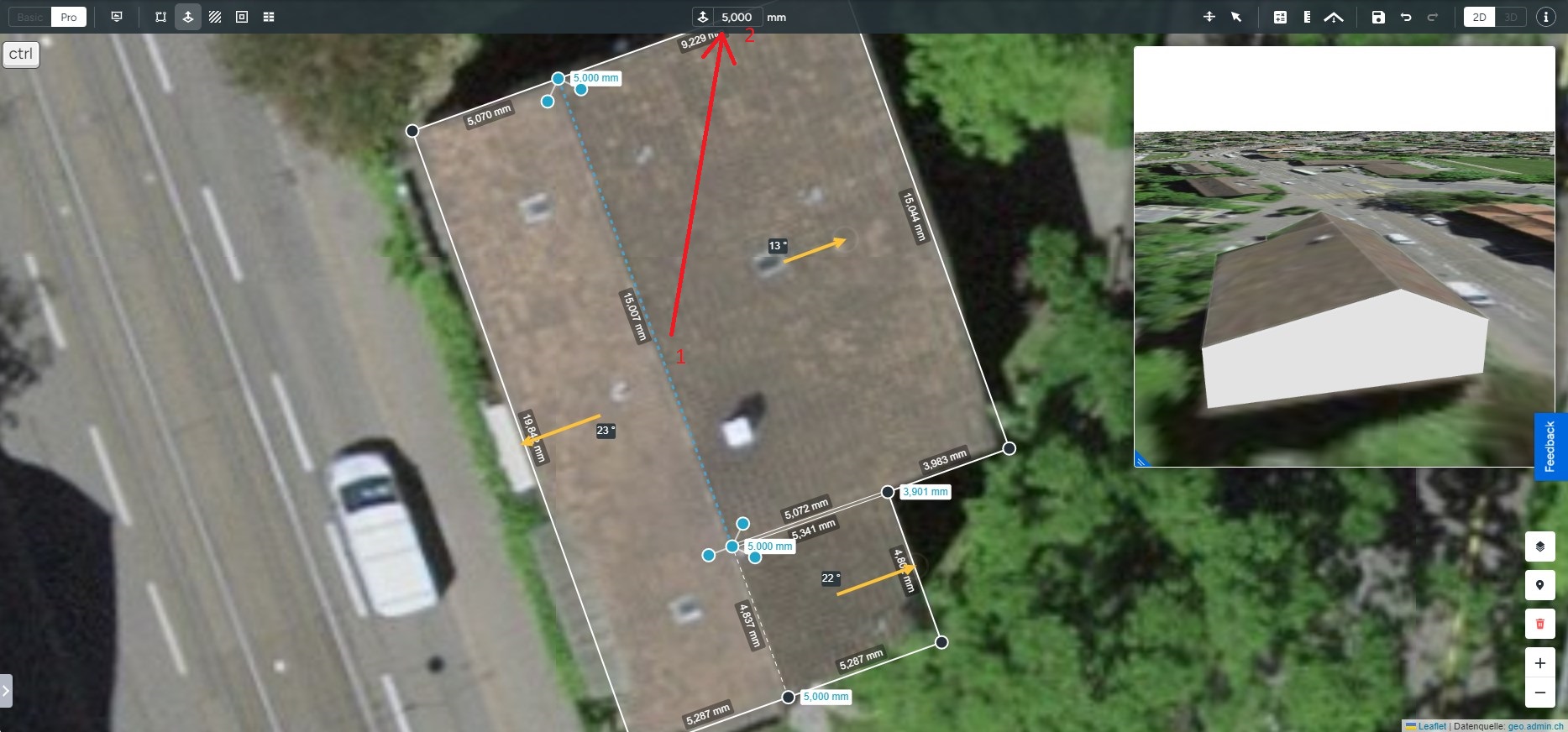 Utilisez-le cercle/fléche jaune sur le pan de toiture pour définir son inclinaison et sa direction. Cette fonctionnalité est adaptée uniquement aux bâtiments avec une pente simple, comme un toit en appentis, pour les toits avec plusieurs pans cette méthode peut modifier la géométrie. Pour les bâtiments avec plusieurs pans de toiture, nous recommandons d'ajuster la hauteur de la bordure la plus haute qui représente la crête du toit.