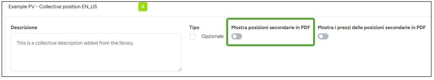 Attivare la funzione Mostra posizioni secondarie su PDF per includere le sottovoci nel trasferimento in Bexio.